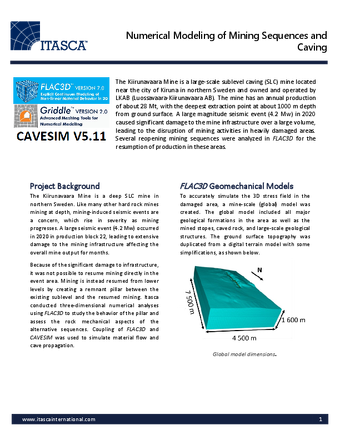 Because of the significant damage to infrastructure, it was not possible to resume mining directly in the event area. Mining is instead resumed from lower levels by creating a remnant pillar between the existing sublevel and the resumed mining. Itasca conducted three-dimensional numerical analyses using FLAC3D to study the behavior of the pillar and assess the rock mechanical aspects of the alternative sequences. Coupling of FLAC3D and CAVESIM was used to simulate material flow and cave propagation.